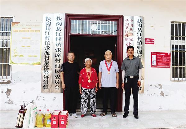7月1日,扶溝縣委宣傳部駐江村鎮(zhèn)張龐行政村第一書記齊華中(左一)和村“兩委”干部走訪慰問該村兩位黨齡超過50年的黨員,為他們送去黨組織的關懷與溫暖。據了解,90歲的張秀真(左二),1957年入黨。76歲的劉學明(左三),1970年入黨。