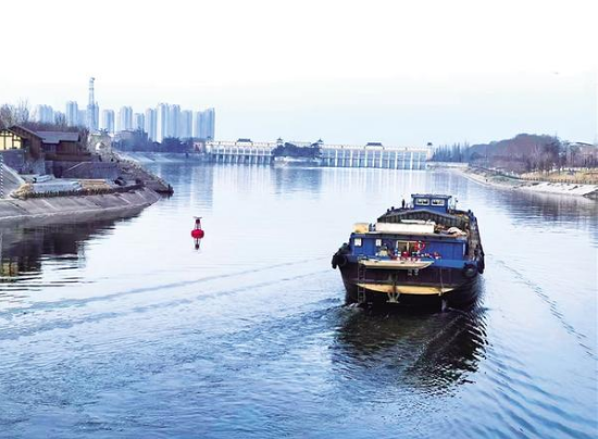 一艘貨船緩緩駛過南寨歷史文化街區(qū)大渡口,水波蕩漾間,將千年古渡與現(xiàn)代航運相連。