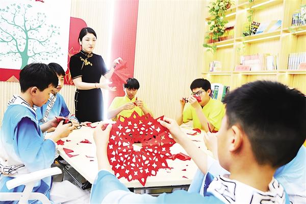 “五一”假期,周口市非物質(zhì)文化遺產(chǎn)剪紙項目代表性傳承人劉秀華(左三)在淮陽伏羲公園的石榴學(xué)堂內(nèi),為學(xué)生講授剪紙知識,既提高了學(xué)生的剪紙水平及欣賞能力,又豐富了他們的假日文化生活。