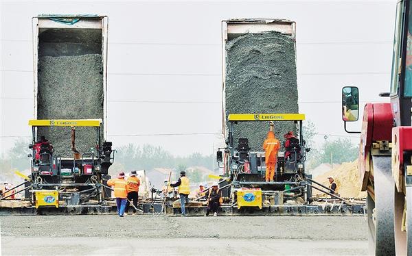 4月24日上午,工人們?yōu)?29國(guó)道改建路段鋪設(shè)第一層碎石路基。據(jù)了解,329國(guó)道改建路段全長(zhǎng)5.879公里,西起商水縣童崗村,折而向南又向東,至后趙寨村,呈直角形,為城市主干道,雙向八車(chē)道。