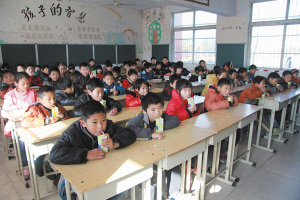 課間,學(xué)生正在飲用“學(xué)生奶”。