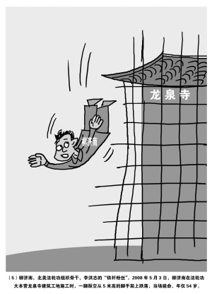 ③ 柳濟(jì)南,北美法輪功組織骨干,李洪志的鐵桿粉絲。2008年5月3日,柳濟(jì)南在法輪功大本營龍泉寺建筑工地施工時(shí),一腳踏空從5米高的腳手架上跌落,當(dāng)場斃命,年僅54歲。(漫畫作者 星雨)