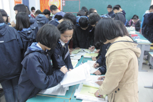 該校將課堂名字定為“求真大課堂”,以“真”字作為學(xué)校一切教育教學(xué)和管理的衡量標(biāo)準(zhǔn)。朱貴華說,求真就是要真教、真學(xué)、真嚴(yán)、真愛、真實(shí)、真會。為提高課堂教學(xué)效果,該校總結(jié)出一套獨(dú)特的課堂教學(xué)方法——“七音和鳴”。分管教學(xué)工作的副校長徐其運(yùn)用“1234567”,即哆來咪發(fā)唆拉西”來詮釋“七音和鳴”法。“1”就是一個學(xué)習(xí)目標(biāo);“2”就是提前兩分鐘進(jìn)班,布置2個任務(wù)(出示目標(biāo)、檢查學(xué)情);“3”就是準(zhǔn)備3個本子,即學(xué)情檢效本、跟蹤本、糾錯本;“4”是4個維度考評,即高速度、準(zhǔn)確度、干凈度、參與度;“5”是5個跟蹤,即節(jié)跟蹤、日跟蹤、周跟蹤、月跟蹤、學(xué)期跟蹤,堅持“抓緊跟蹤不放松、我在文昌必成功”的教育信念;“6”是6個環(huán)節(jié),即激情導(dǎo)入、自研自探、合作探究、展示質(zhì)疑、師生點(diǎn)評、當(dāng)堂檢測;“7”是7個評價,即教師的教案、學(xué)生的學(xué)案、練案、觀課記錄的每周業(yè)務(wù)評價及對學(xué)生的即時性、激勵性、長效性評價。