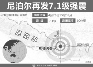 據(jù)新華社北京4月26日電 綜合新華社記者報(bào)道:25日發(fā)生在尼泊爾中部的強(qiáng)烈地震已經(jīng)造成尼境內(nèi)至少1805人遇難,另有4718人受傷。中國(guó)西藏、印度、孟加拉國(guó)、不丹等地均出現(xiàn)人員傷亡。中國(guó)政府正在組織緊急救援物資,將盡快運(yùn)抵尼泊爾災(zāi)區(qū),中國(guó)國(guó)際救援隊(duì)已于26日清晨啟程赴尼泊爾開(kāi)展災(zāi)后救援工作。