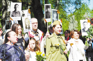 ?、?月9日,在拉脫維亞首都里加,人們手持在衛(wèi)國(guó)戰(zhàn)爭(zhēng)中犧牲的親人照片參加紀(jì)念衛(wèi)國(guó)戰(zhàn)爭(zhēng)勝利70周年活動(dòng)。