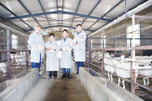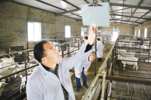 孫振偉原是當?shù)刂那嗄昶髽I(yè)家,2008年初被西關(guān)村居民高票選舉為村黨支部書記,憑著對家鄉(xiāng)的強烈責(zé)任感和保護槐山羊特色品種的使命感,孫振偉帶領(lǐng)西關(guān)村立足本村作為槐山羊傳統(tǒng)養(yǎng)殖區(qū)的優(yōu)勢,于2010年成立沈丘縣槐山羊養(yǎng)殖發(fā)展有限公司,在省畜牧展交易會上,與鄭州鄭源公司合作,共同簽約了投資6000萬元建設(shè)槐山羊原種保護、繁育、深加工項目。同時與華中農(nóng)大建立技術(shù)合作關(guān)系,投資800萬元建成“槐山羊原種保護和繁育中心”,規(guī)劃設(shè)計了化驗室、消毒室、提純復(fù)壯室、品種基因室等配套規(guī)范設(shè)施,不僅為國家級優(yōu)良品種槐山羊的保種提純工作提供了科研平臺和寶貴數(shù)據(jù)庫,“槐山羊提純復(fù)壯良種繁育技術(shù)研究與應(yīng)用”成果還獲得2013年度周口市科技進步一等獎。經(jīng)過提純復(fù)壯,目前中心存欄特征明顯的槐山羊母羊860只、種公羊36只,在此基礎(chǔ)上,計劃建成占地100畝的槐山羊養(yǎng)殖小區(qū),槐山羊板皮、肉制品等深加工項目都已經(jīng)開始實施。 “這些是經(jīng)過第五輪提純復(fù)壯繁育的槐山羊,目前可以說是最純種的槐山羊了?!睂O振偉指著一批剛出生的小羊向我們介紹。