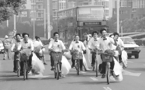 鄭州:騎著單車娶新娘 5月23日,新郎帶著新娘騎行在鄭東新區(qū)。 當(dāng)日,由鄭州晚報(bào)等單位主辦的“幸福相約”鄭州青年集體婚禮在鄭東新區(qū)舉行,共有16對(duì)新人參加。婚禮上,新郎騎著自行車迎娶新娘,倡導(dǎo)低碳、簡(jiǎn)約婚禮。新華社記者 趙鵬 攝