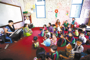 尼泊爾學校復課 5月31日,在尼泊爾的巴克塔普爾,復課的學生們接受音樂治療。據(jù)尼泊爾當?shù)孛襟w報道,尼泊爾教育部已經宣布,全國14個地震受災縣的學校將于5月31日復課。新華社發(fā)