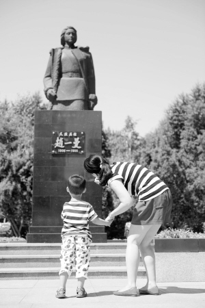 7月5日,在哈爾濱東北烈士紀(jì)念館旁的烈士廣場(chǎng),一名母親為孩子講述民族英雄趙一曼的英勇事跡。在“七七事變”紀(jì)念日即將到來之際,眾多游客來到哈爾濱東北烈士紀(jì)念館參觀,接受愛國主義教育。右圖為一名訪客在哈爾濱東北烈士紀(jì)念館內(nèi)參觀記錄。新華社記者 王凱 攝